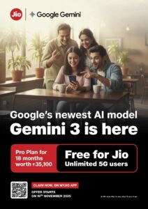 In a major push to democratise next-generation artificial intelligence, Jio has elevated its AI portfolio by integrating Google’s newly launched Gemini 3 model into its Jio Gemini Pro Plan, now being offered free for 18 months to all customers on the Jio Unlimited 5G data plan. The strategic move, which significantly widens the earlier youth-exclusive offer, positions Jio at the forefront of India’s rapidly evolving AI-driven telecom landscape.