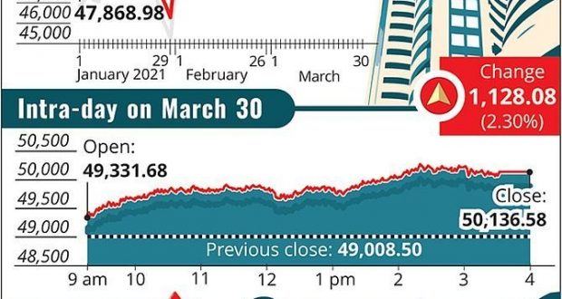 The 30-share BSE index ended 1,128.08 points or 2.30 per cent higher at 50,136.58.