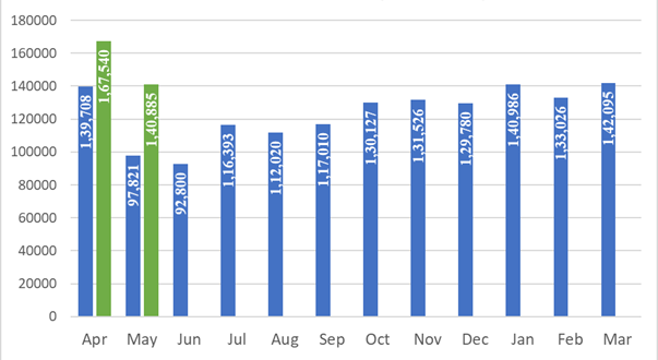 The revenues for the month of May 2022 are 44 percent higher than the GST revenues in the same month last year of Rs 97,821 crore. During the month, revenue from import of goods was 43 percent higher and the revenues from domestic transaction (including import of services) are 44 percent higher than the revenues from these sources during the same month last year.