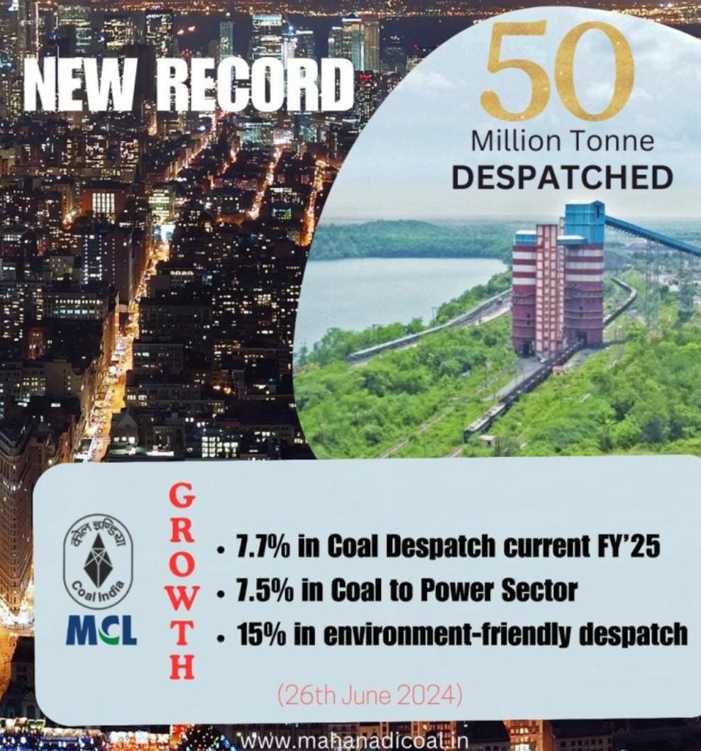 Sambalpur, June 27, 2024 (TBB Bureau): Mahanadi Coalfields Limited (MCL) has achieved a remarkable milestone by surpassing 50 million tonnes (MT) of coal dispatch for the fiscal year 2024-25. This achievement came seven days ahead of the previous record, setting a new benchmark in operational excellence for the company.